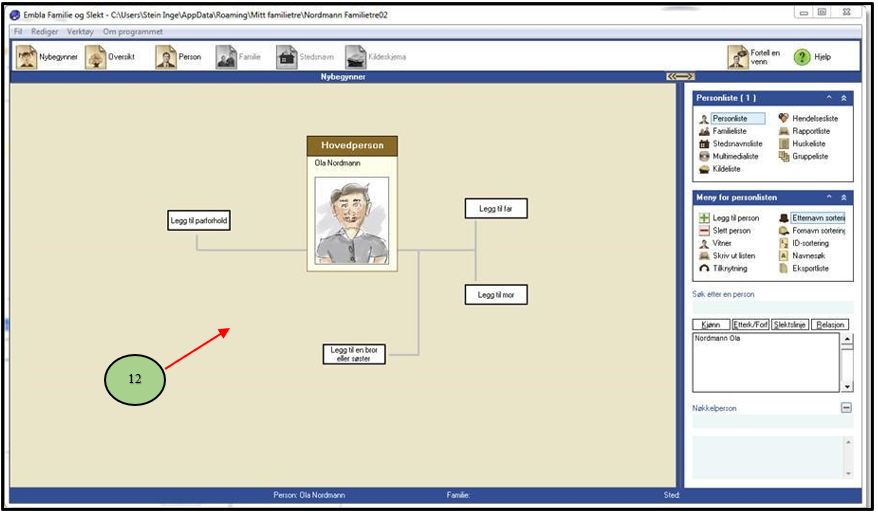 12. The entire genealogy program is now displayed. Note that your name is inserted as the main character, along with a drawing of a man (or woman).