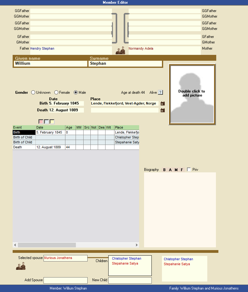 - The part in the middle consists of many different detail fields. Here you can fill in or change names, gender, dates, place names, events, photos, biography, address, etc. This is also where we add sources. It is also possible to change the design of this part to suit you. As you learn to use the program, you can change the form. You make changes from Tools >> Program Setup >> Person