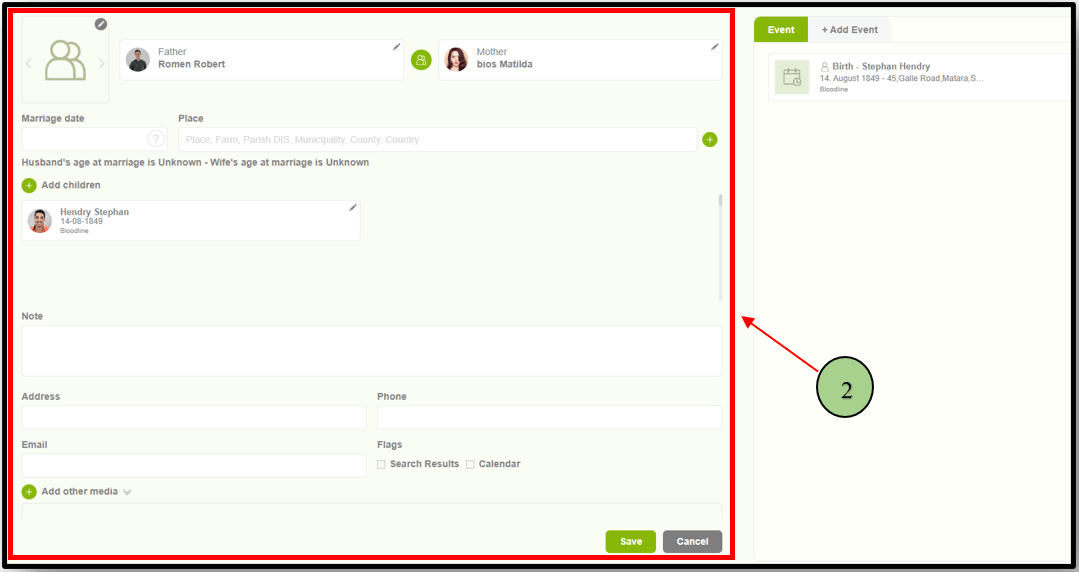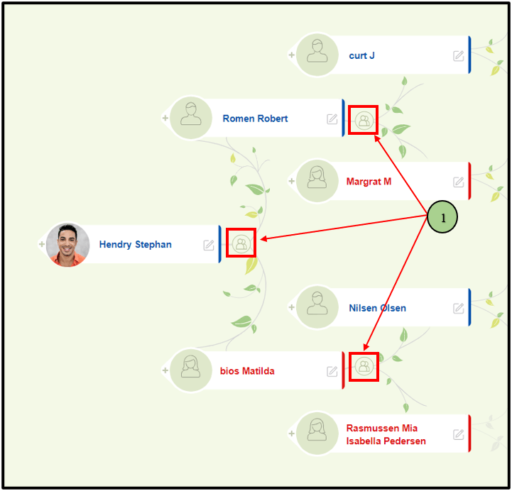 01) Users can navigate to the ‘Family editor’ by clicking on the “family” icon against each person in the tree editor. Here, the user can view his parent’s family.
