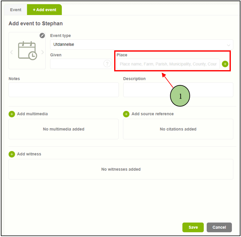 1. Users can add an event location by selecting the “Add place” button (+).