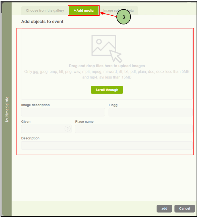 3. The second tab, labeled “+ Add media,” enables users to either browse their device for multimedia files or utilize the drag-and-drop feature to upload files directly. Supported file formats include jpg, jpeg, BMP, tiff, png, wav, mp3, MPEG, ms word, RTF, txt, pdf, plain, doc, Docx (less than 5MB), as well as mp4 and avi formats (file size must be less than 15MB).