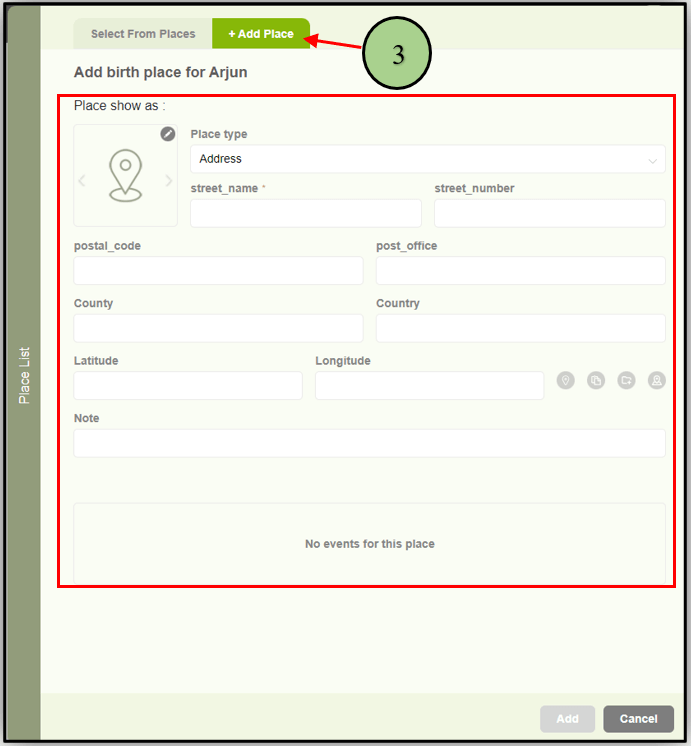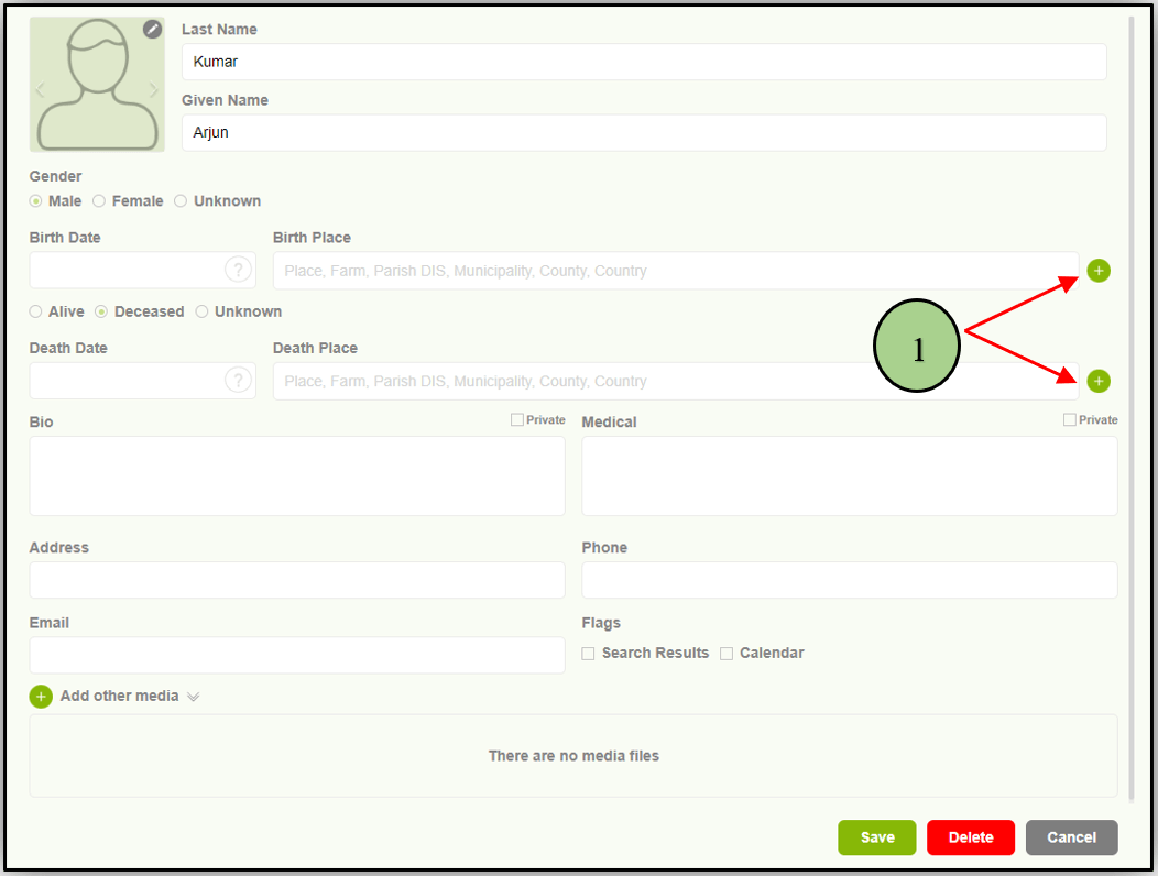 1. Users can add a Birthplace or a deathplace by clicking on the “+” icon in the member editor page