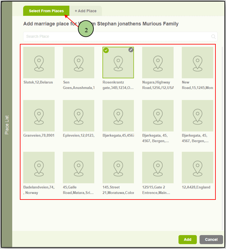 1. Users can add marriage place by clicking on the “+” icon display against the location text box in the family editor page