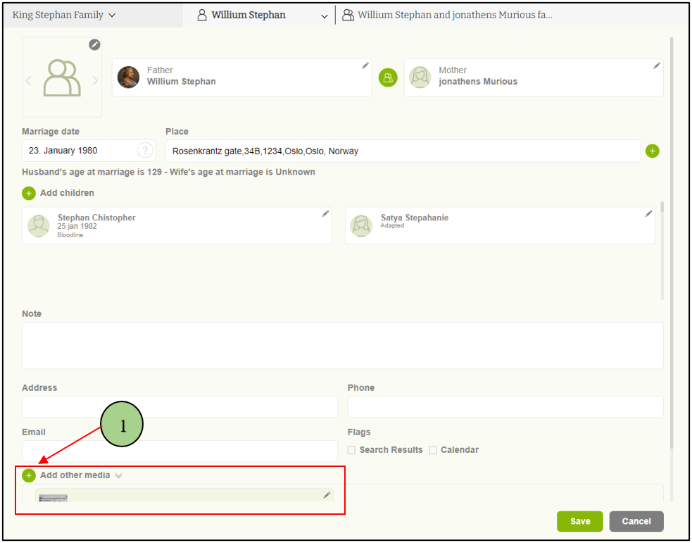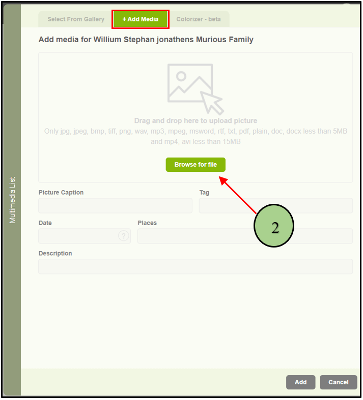 1. Users can add images for family profiles, but if they need to upload documents, videos, and audio to their profile, it is enabled with the other media section.