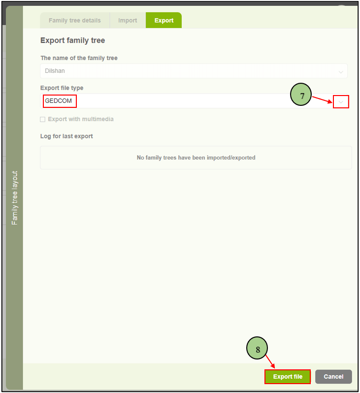 8. Within the side window, use the drop-down icon to select the “Gedcom” option from the available options.