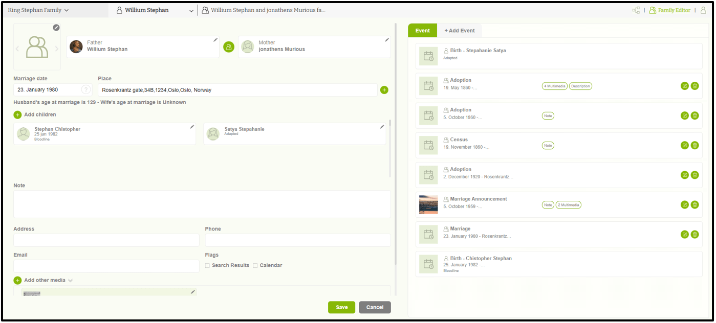 Users can view basic family information in the “Family Editor” Tab. Here, users can view the father and mother’s names. Their marriage date and location, Children’s names, Notes, and Address