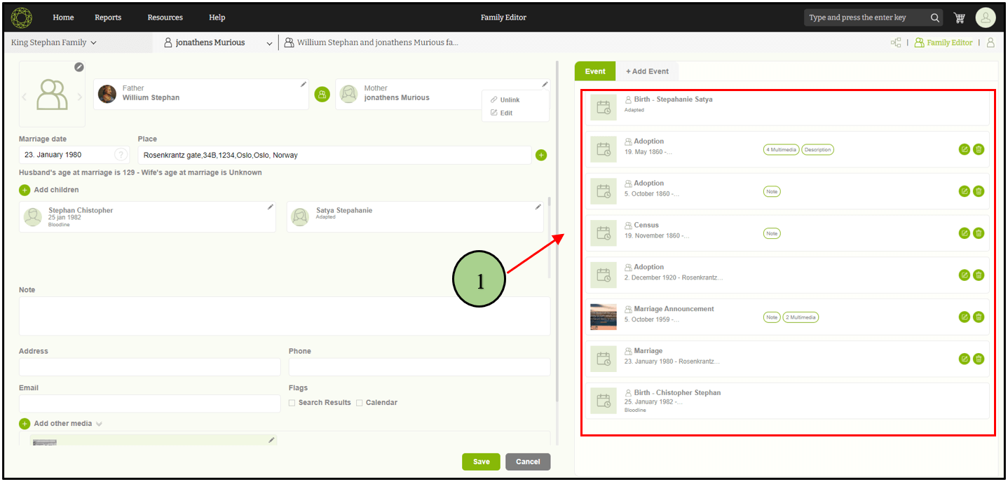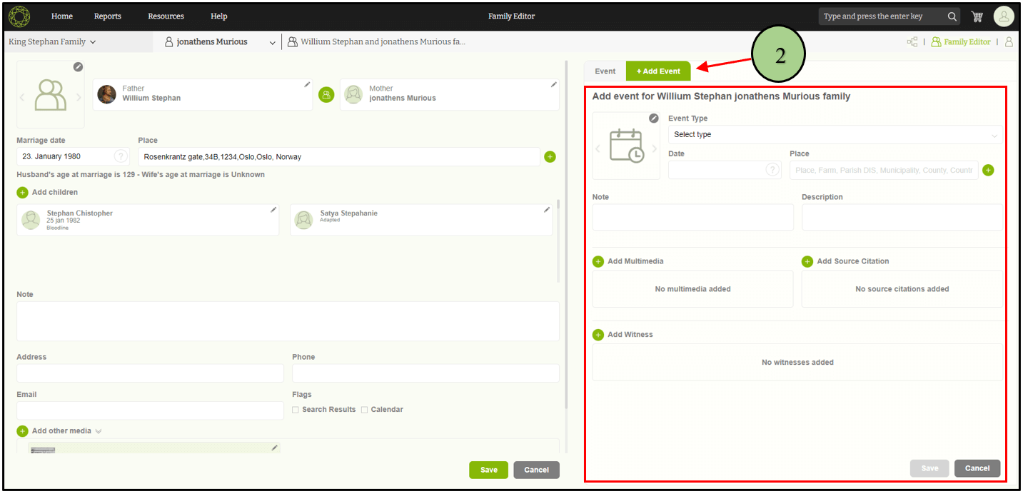 2. Users can add a family event by clicking on the “Add event” tab in the right pane of the person edit page.