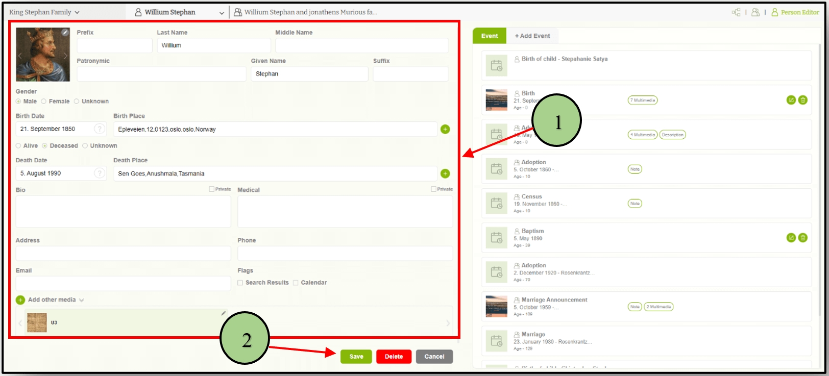 2. User can add their ‘First Name’, ‘Middle name’, ‘Last name’, ‘Patronymic name’,’ Prefix’ and ‘suffix’, Sex, Birthdate, Birthplace, Death date, Deathplace, Biography, Address, Medical Records, and Media files.