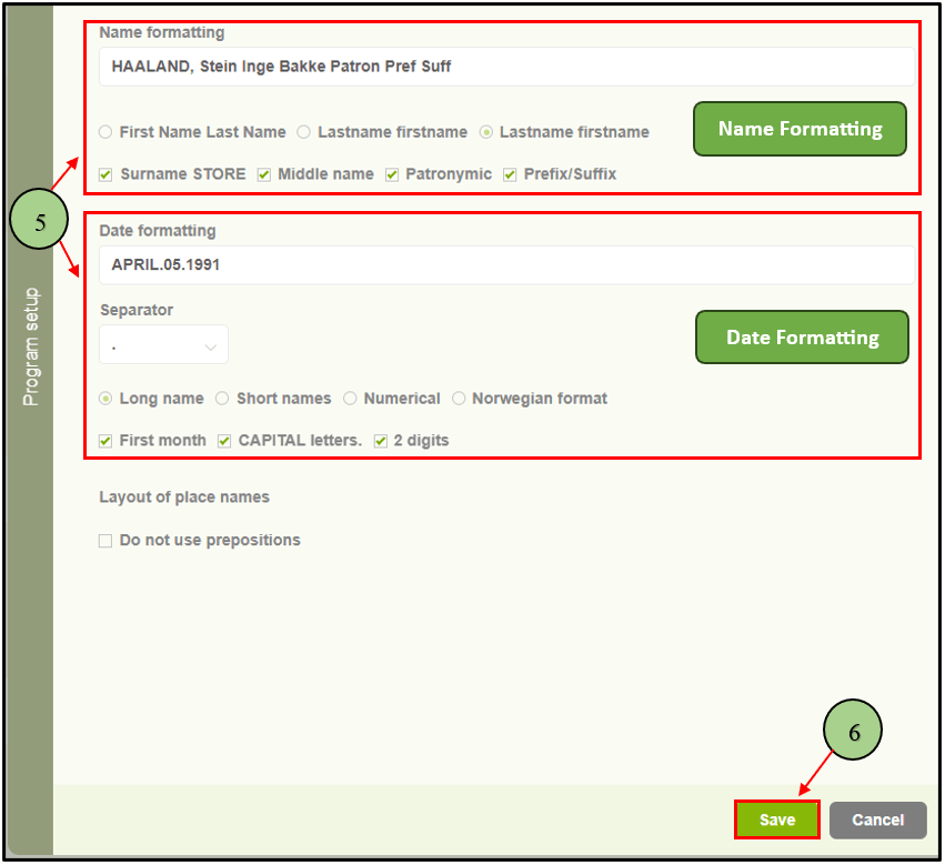 5. After selecting an option, users can customize the formatting for displaying names and dates according to their preferences. When the user alters the name formats, the formatting text box will display how the names will appear in the system, allowing the user to preview the changes.