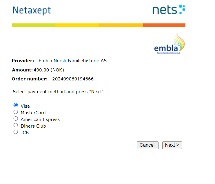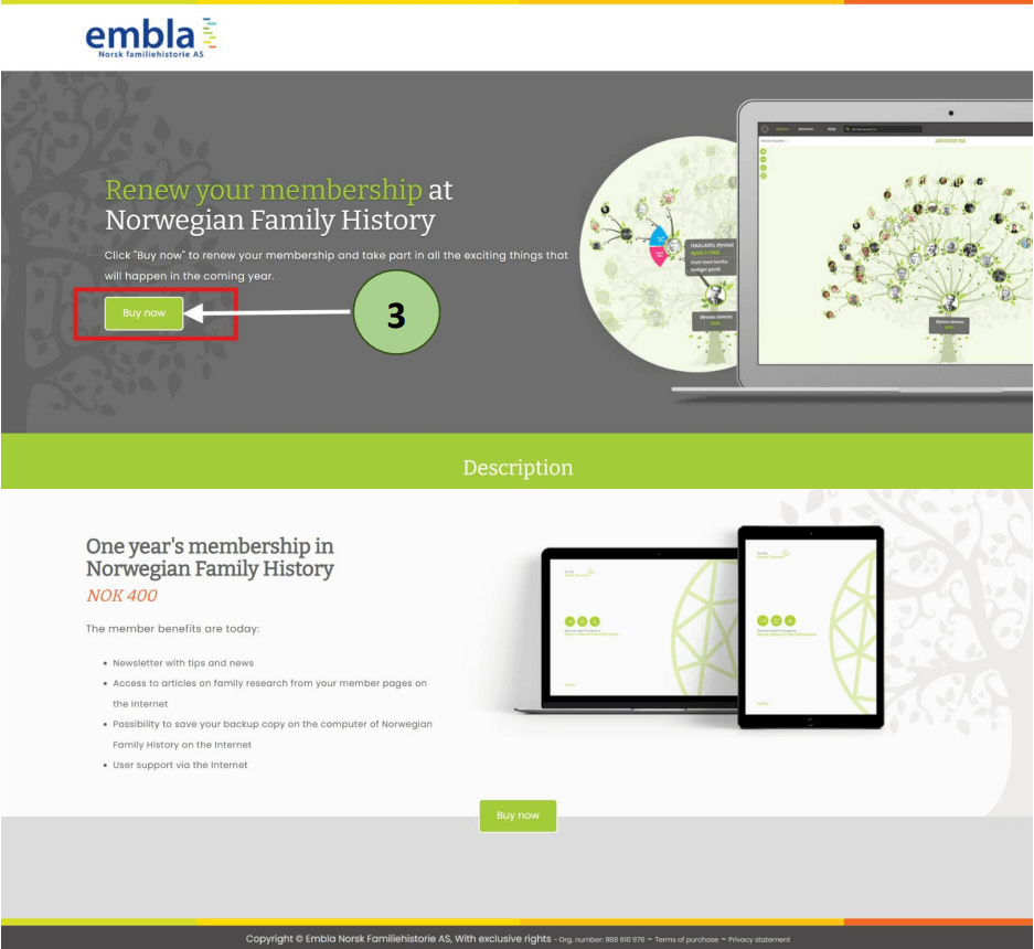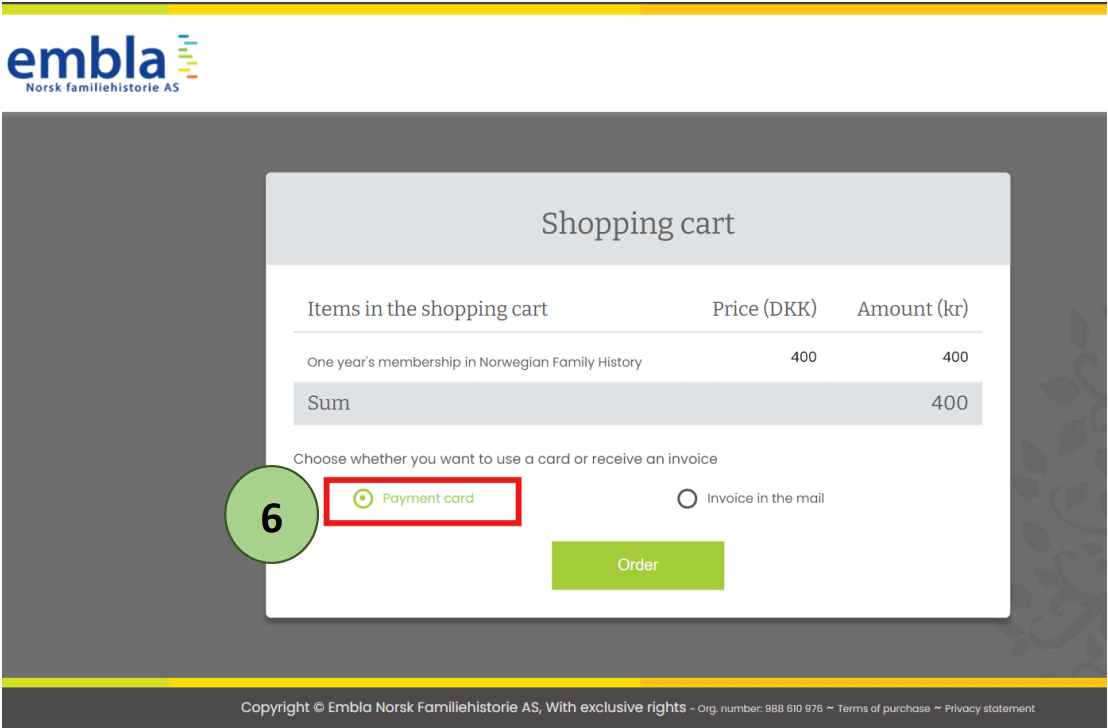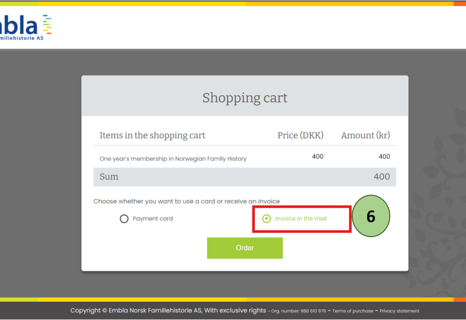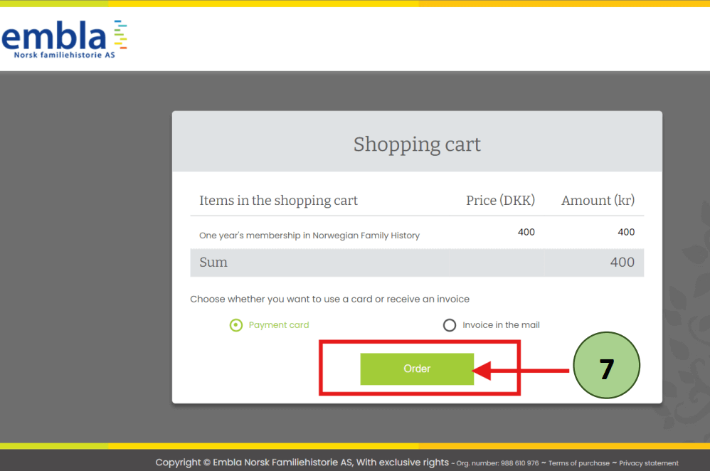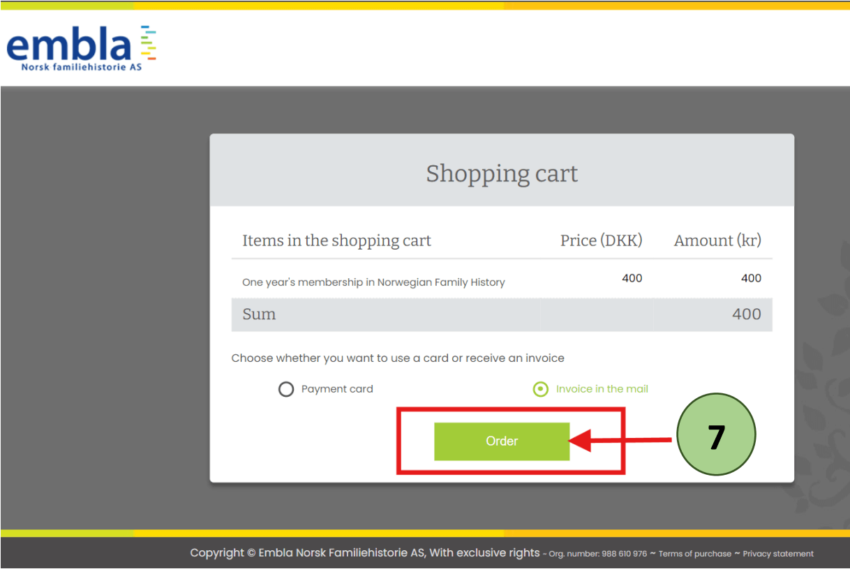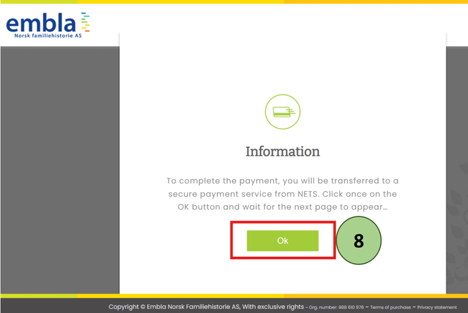 After that you will be redirected to the “Embla Norwegian Family History” Page again and you will receive an email with the invoice.