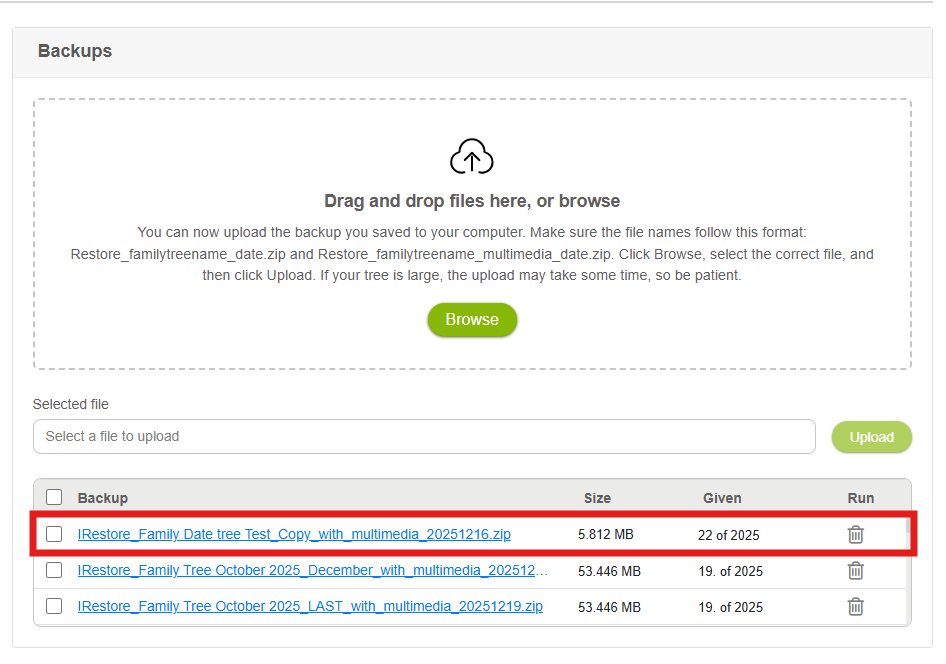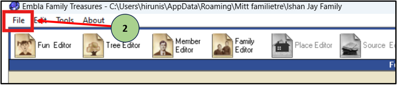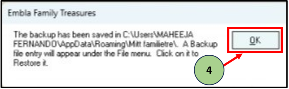 Ex-: “C:\Users\<Username>\AppData\Roaming\Mitt familietre\<backup file.”