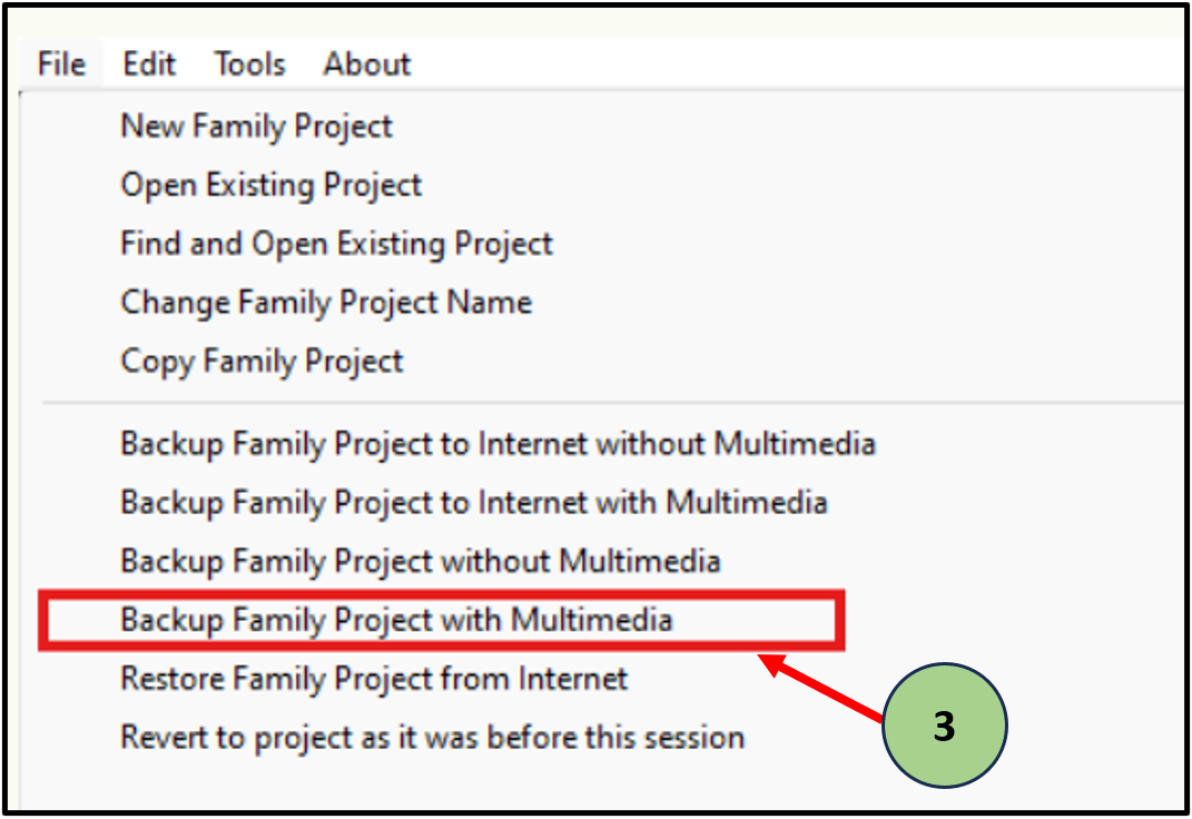 - The first one is “Backup Family Project with Multimedia”. This will save both your family tree data and any associated multimedia files locally as a zip file.