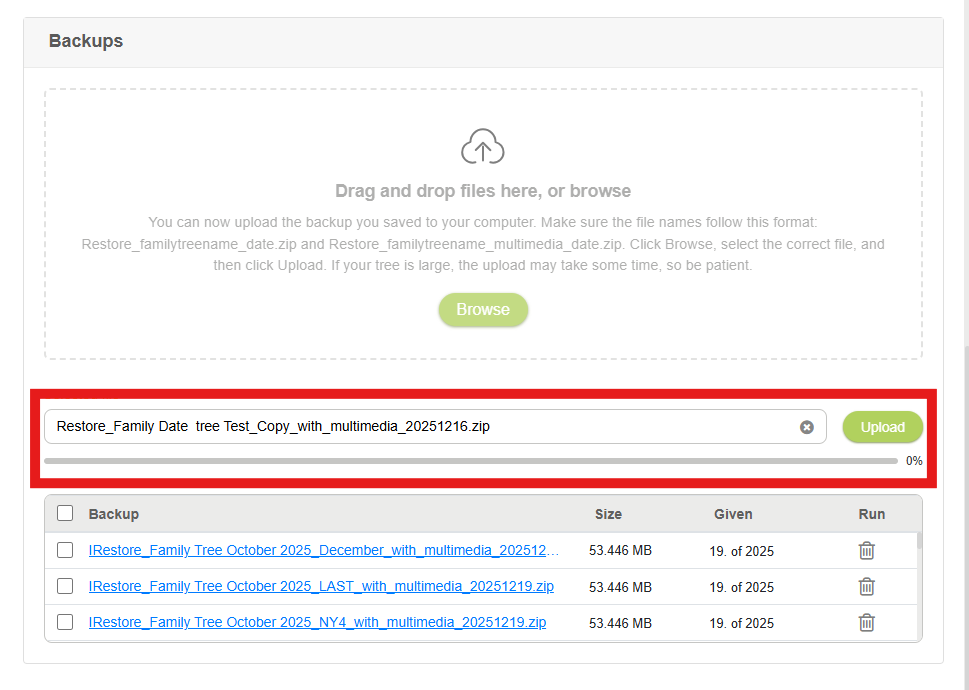 15. When the progress bar reaches 100%, the backup list will be updated with the newly uploaded backup.