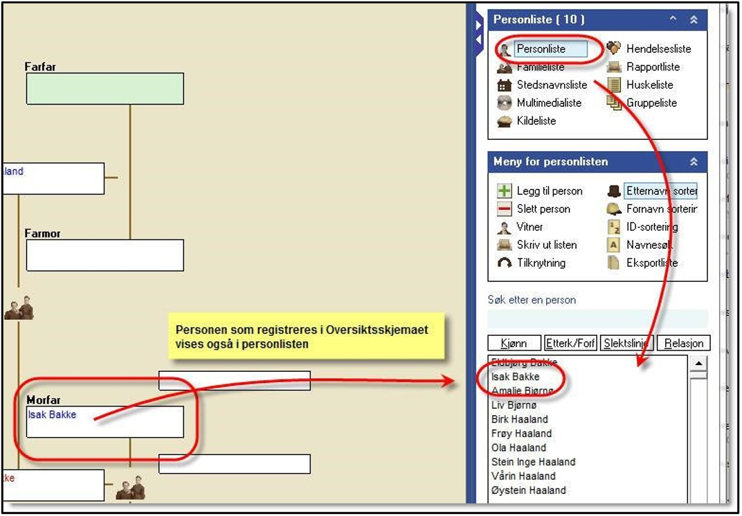 Tips: Legg også merke til at det navnet du nettopp registrerte i treet nå er synlig i personlisten til høyre på skjermen.