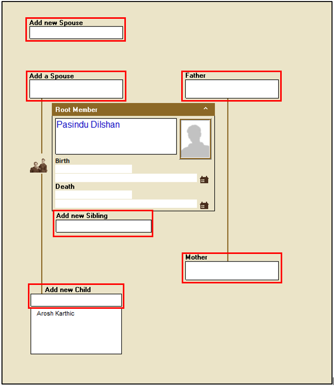 For å bygge ut treet markerer du først det feltet hvor du ønsker å legge til en ny person. Å «markere» betyr å klikke en gang med vestre musetast.