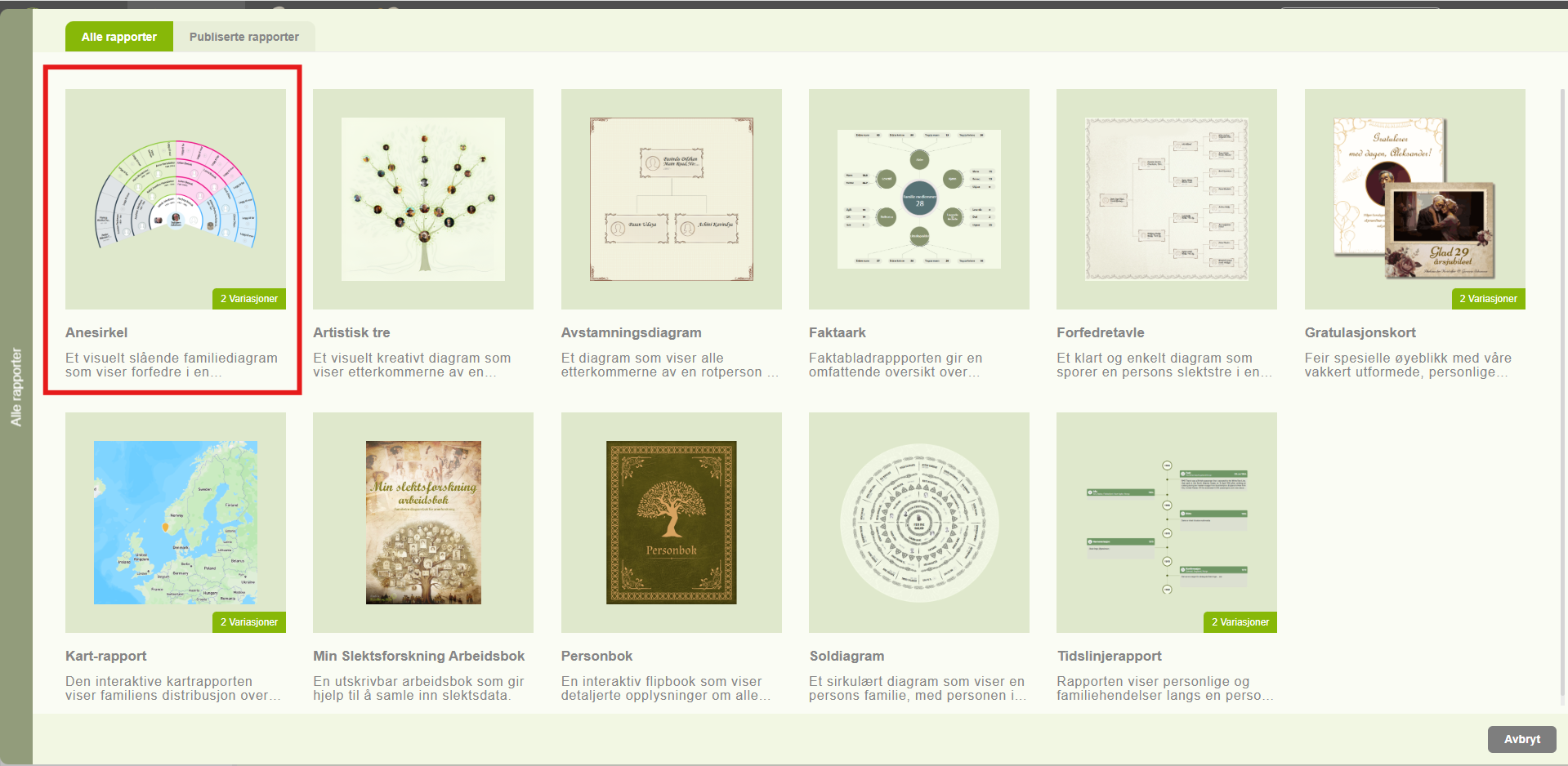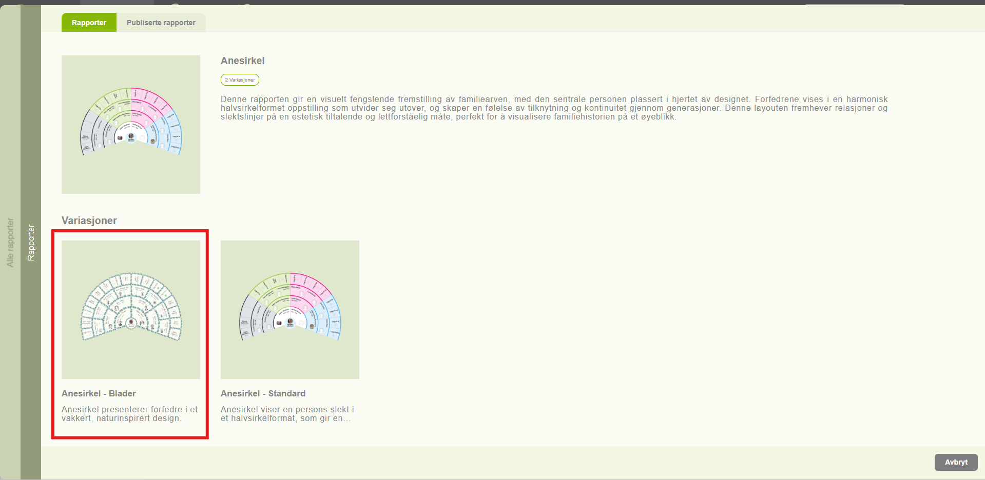 2.Klikk på Anesirkel-alternativet — du vil se en etikett kalt “2 varianter”, som indikerer at denne rapporttypen inkluderer to underkategorier.