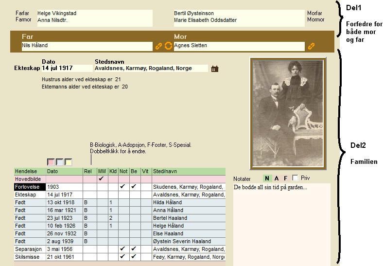 2. Familien i sentrum – i Familieskjemaet kobles personer sammen til kjernefamilier, far og mors samlivsforhold kan registreres, og familiens historie kan dokumenteres med hendelser og bruk av fritekstfelt.