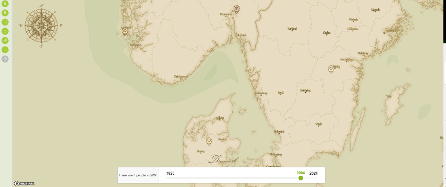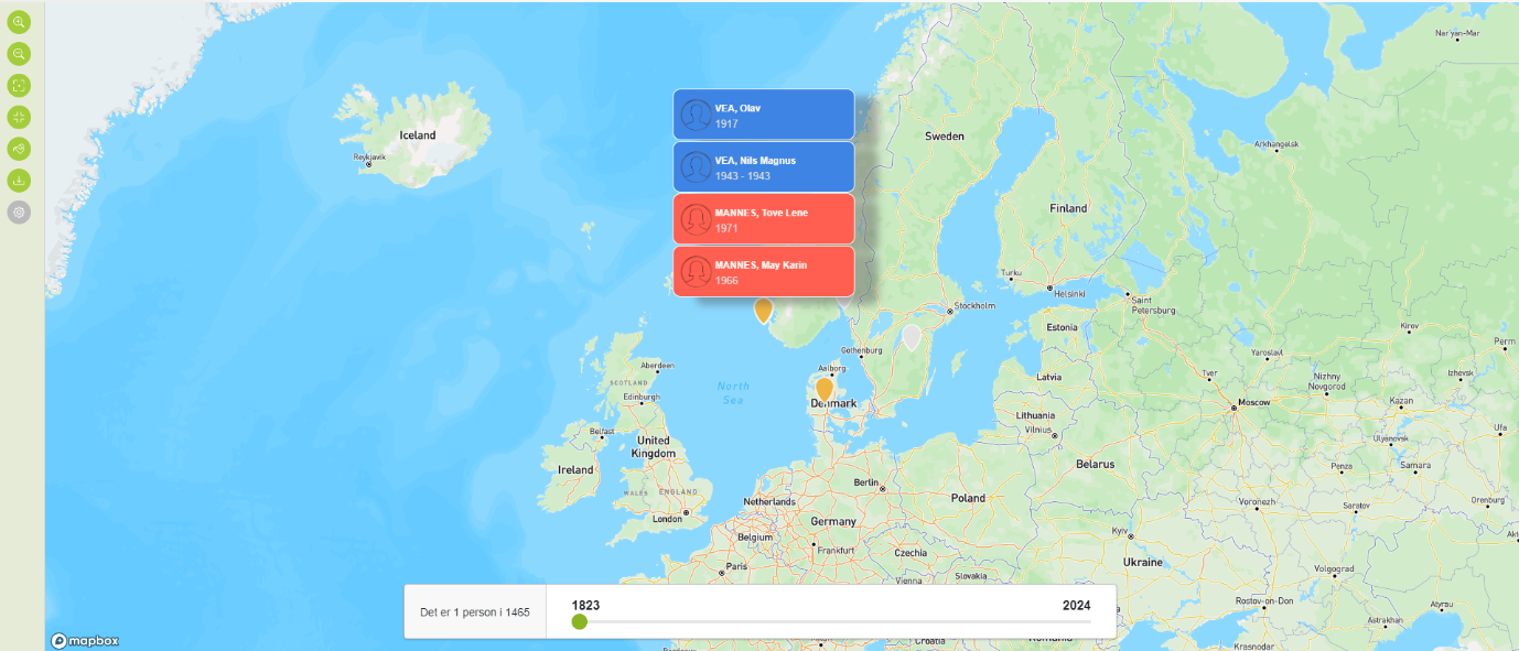 Bortsett fra den estetiske tiltrekningen, tilbyr den interaktive kartfunksjonen et mangfold av brukervennlige egenskaper. Klikkbare nåler gir enkel tilgang til detaljert informasjon om hvert familiemedlem. Ved å klikke på en nål, dukker det opp et informasjonsvindu som viser viktige detaljer som personens navn, fødselsår og eventuelt dødsår. Disse informasjonsvinduene er nøye utformet for å matche nålens farge, og gir brukerne tydelig indikasjon på familiemedlemmets kjønn.