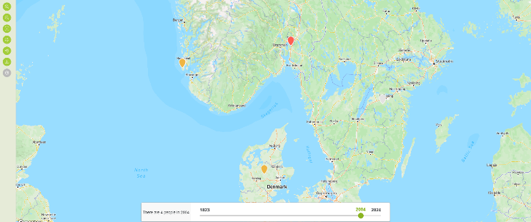 En fremtredende funksjon i den interaktive kartrapporten er inkluderingen av en tidslinjelinje nederst på kartet. Denne tidslinjelinjen gjør det mulig å navigere gjennom ulike tidsperioder ved å flytte en peker frem og tilbake på en tidslinje. Når pekeren beveger seg, justeres fargene på nålene dynamisk for å gjenspeile tidsperiodene der hvert familiemedlem var i live. Nålene beholder sine respektive farger i løpet av personens levetid og går over til grått når pekeren beveger seg utover denne perioden.