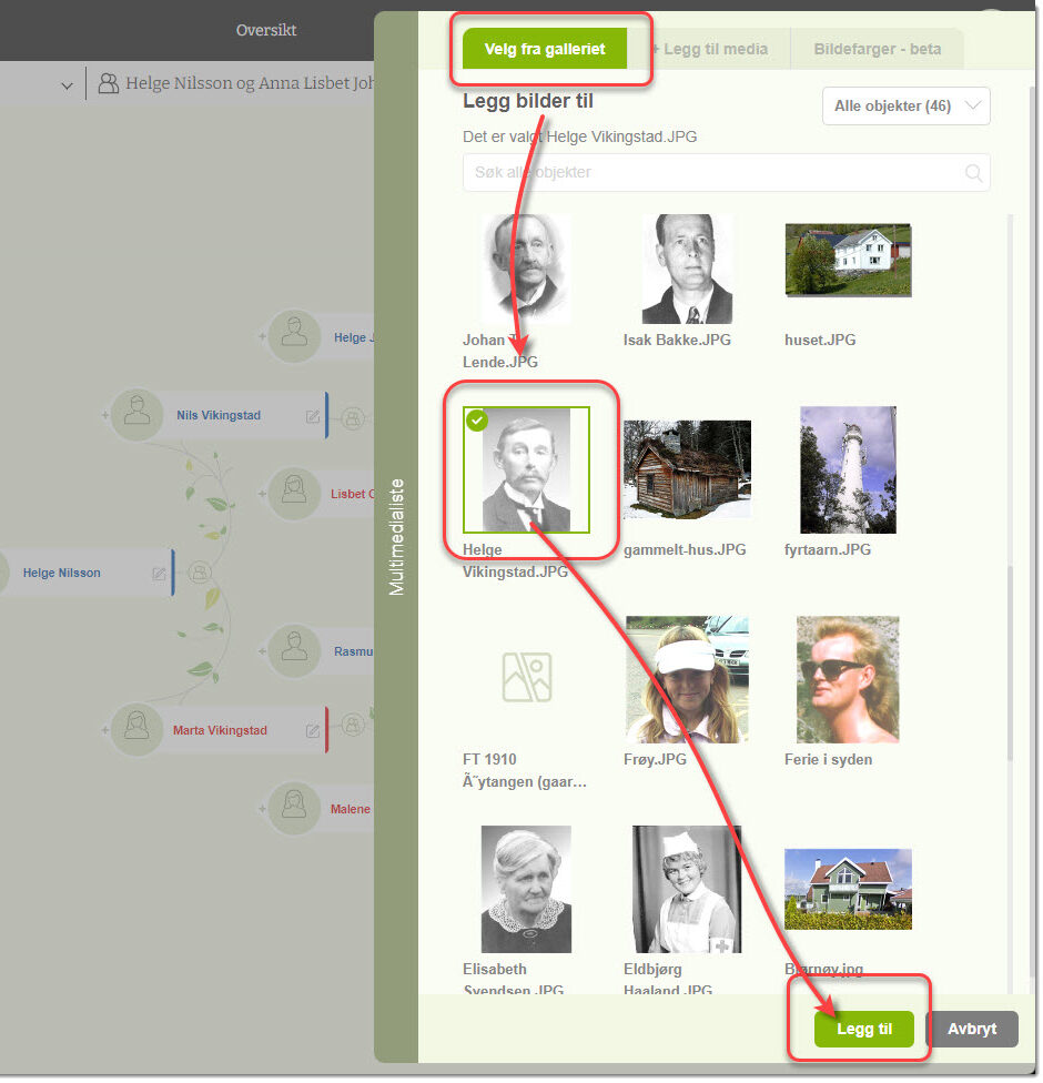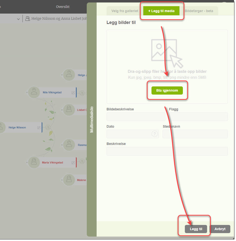 4) Hvis bildet av personen ikke er i familietreet er det mulig å legge inn nye bilder fra fanen for «Legg til media»-knappen.