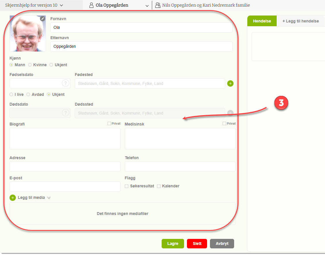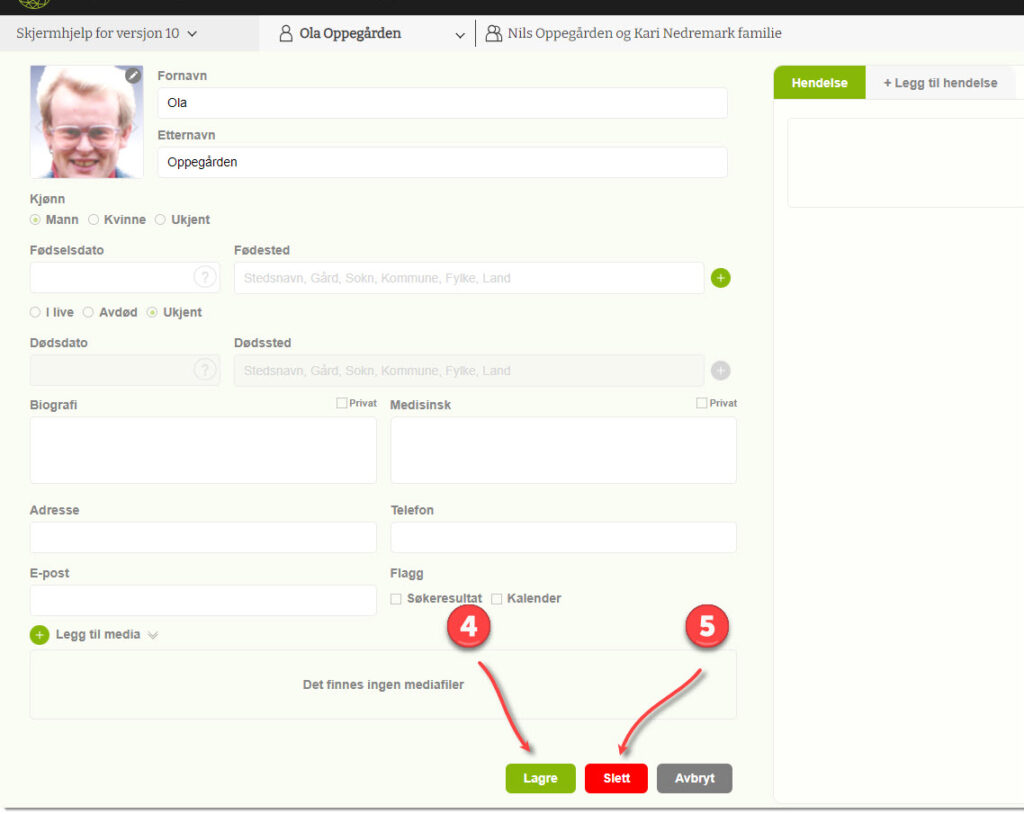 5) Hvis det er ønsker å fjerne denne personen fra famietreet er det mulig å klikke på Slett-knappen. Vær forsiktig så du ikke fjerner personer du egentlig øsnk