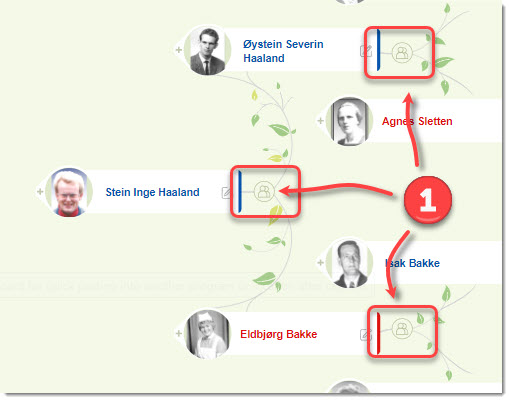 1) Det er mulig å navigere til Familieskjemaet ved å klikke på «familie-ikonet» for hver person i Oversiktsskemaet.