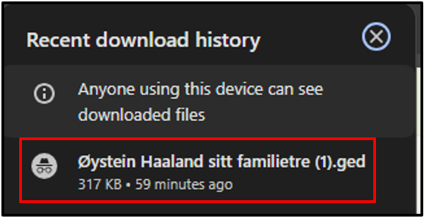 12. Nå vil det være lagret en Gedcom-fil på egen datamaskin som kan benyttes som sikkerhetskop av eget familietre.Ta vare på denne filen. Den kan benyttes i mange forskjellge slektsprogram.