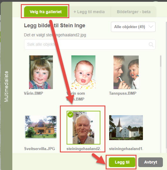 3. Hvis bildet allerede er i slektsprogrammet velger man det enkelt fra galleriet. En fane viser alle eksisterende bilder i slektsprogrammet hvor man velget ett av dem som lam knytter til den aktuelle familien.