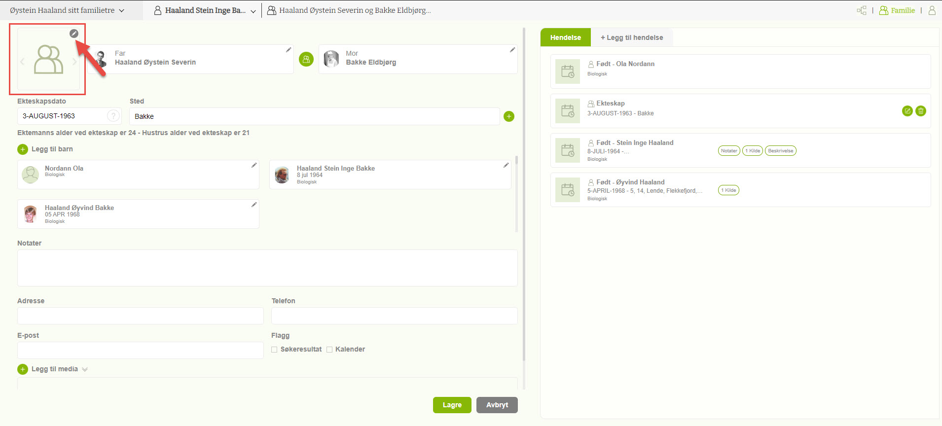 1. Det er mulig å registrere så mange familiebilder man måtte ønske. Klikk på redigeringsikonet ved strektegningen som viser en familie.