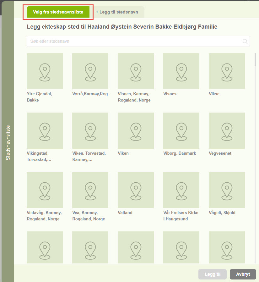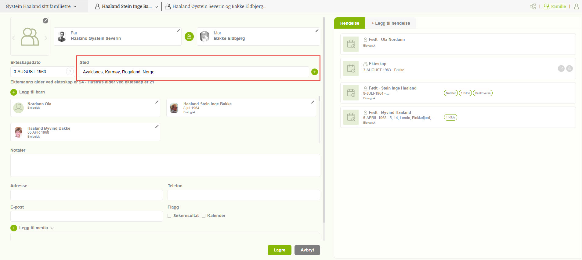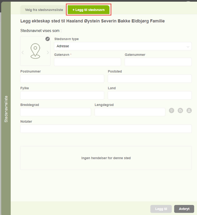 1. Den meste brukte hendelsen i en familie er selve ekteskapet eller bryllupet om man vil. For å legge inn et sted til denne hendelsen er det mulig å klikke på pluss-ikonet helt til høyre i stedsnavnsfeltet.
