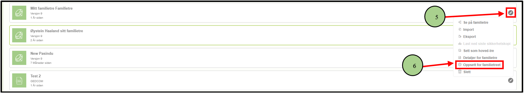 6. En undermeny vises og man velger Oppsett av familietreet»