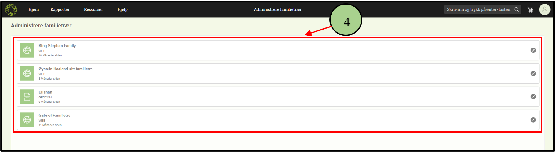 4. Oversikten over alle familietrær vises. Det aller mest normale er å kun ha ett familietre her, men det er mulig å ha så mange man måtte ønske. Jobber man kun med egen familie er det anbefalt å kun ha ett familietre.
