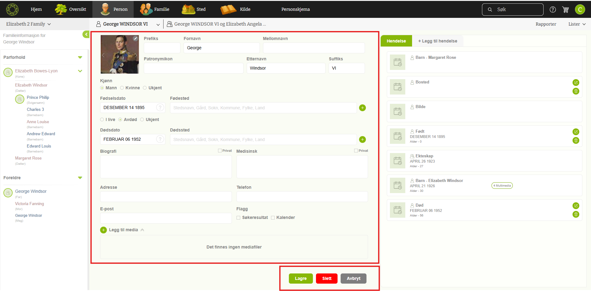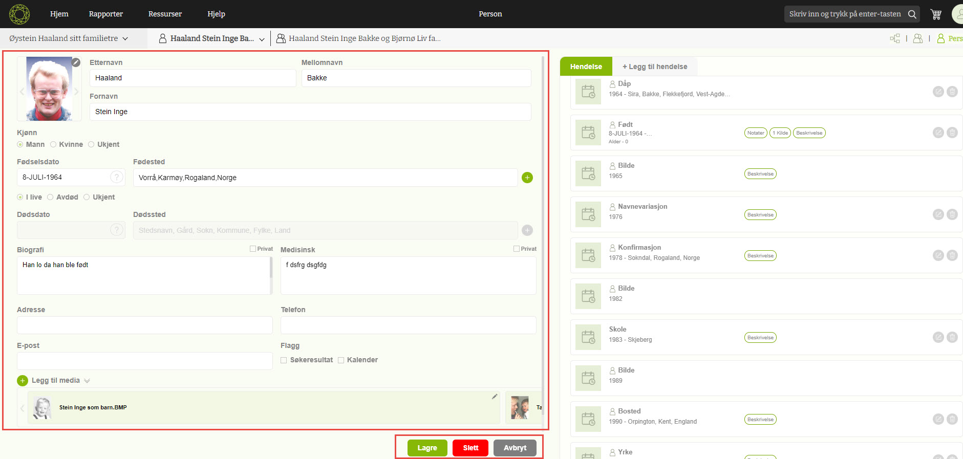 De to hovedhendelsene for født og død vises med egne felt for dato og sted. Alle andre hendelser vises i høyre sidepanel. Kjønn, om personen er i live når informasjonen blir registrert, biografi, medisinske notater, adresse, telefon, epost og media-filer som for eksempel bilder. Alt på sammen siden og enkelt å registrere.