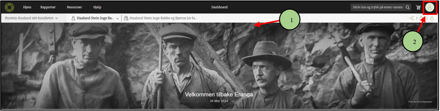 2. Klikk på bildet av deg helt oppe til høyre i slektsprogrammet. Hvis du ikke har lagt inn et bilde av deg enda vil det være et ikon med omriss som viser en person .
