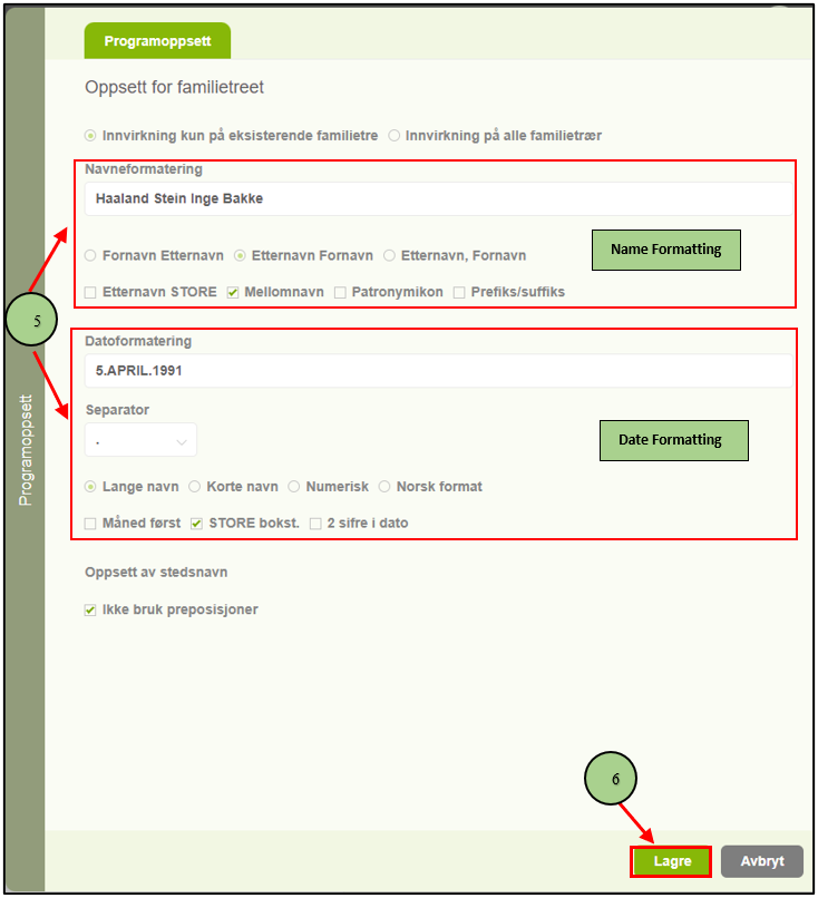 5. I det første området setter man hvordan et person-navn skal vises i slektsprorgrammet. Det er mulig å kun vise foranvn og etternavn eller man kan velge å vise felter for mellomnavn, patronymikon og prefiks og suffiks. Det er også mulig å velge å vise etternavn først og man kan velge å vise alle etternavn med store bokstaver. Her er det mulig å sette programmet opp helt som du måtte ønske å jobbe med personnavn slik at det blir enkelt og oversiktilig for deg.