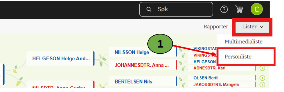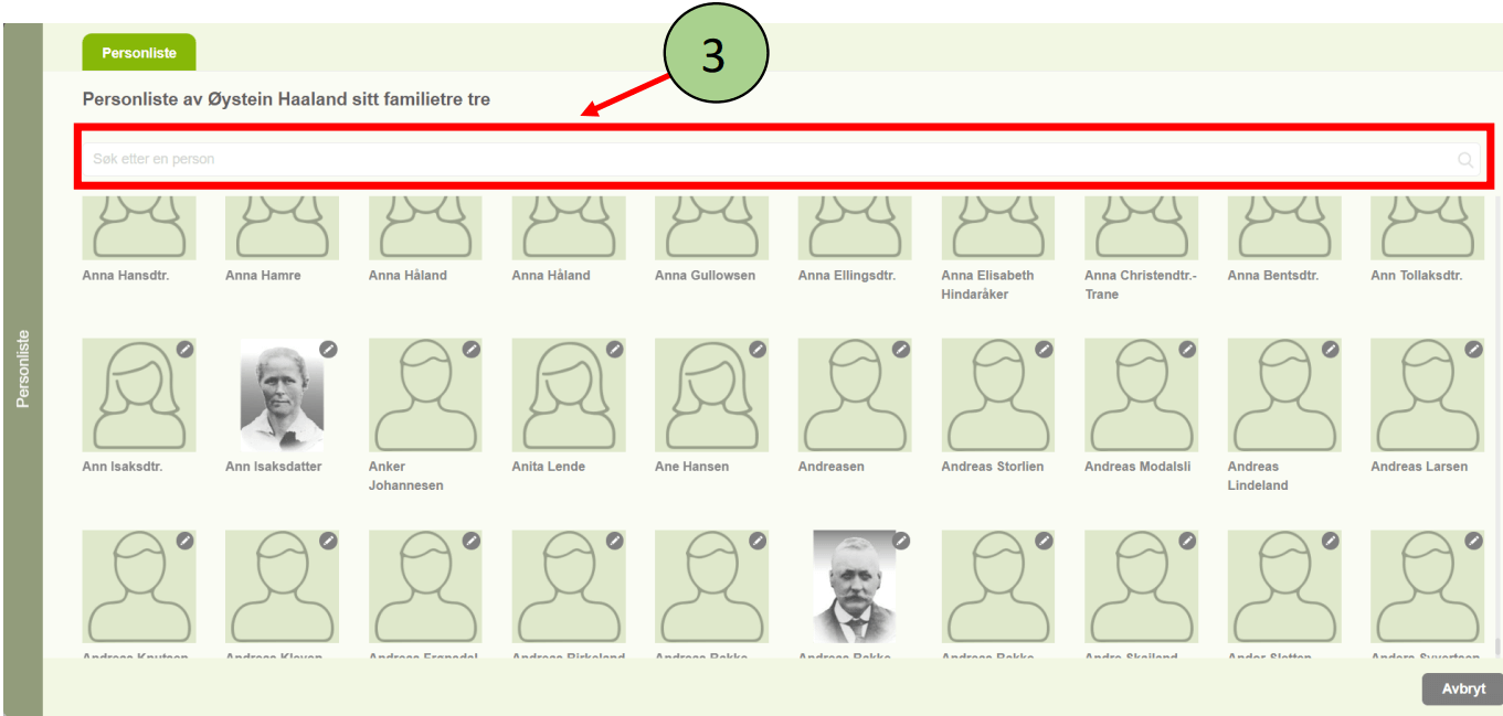 3. Hvis det er mange personer i familietreet er det mulig å søke etter den ønskede personen i søkefeltet øvert i panelet.