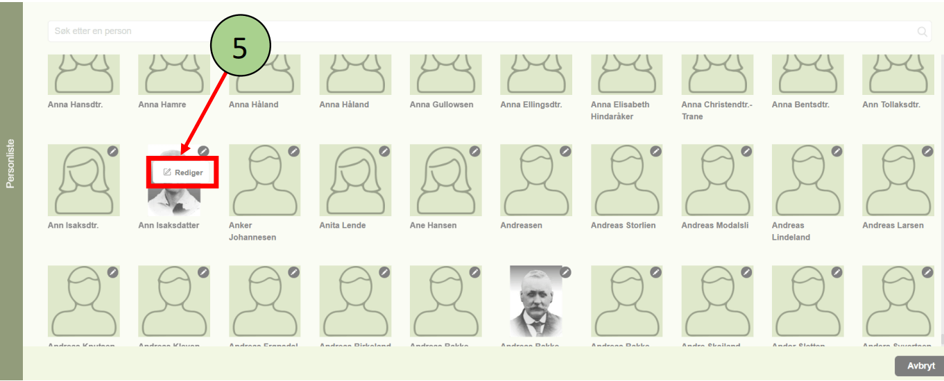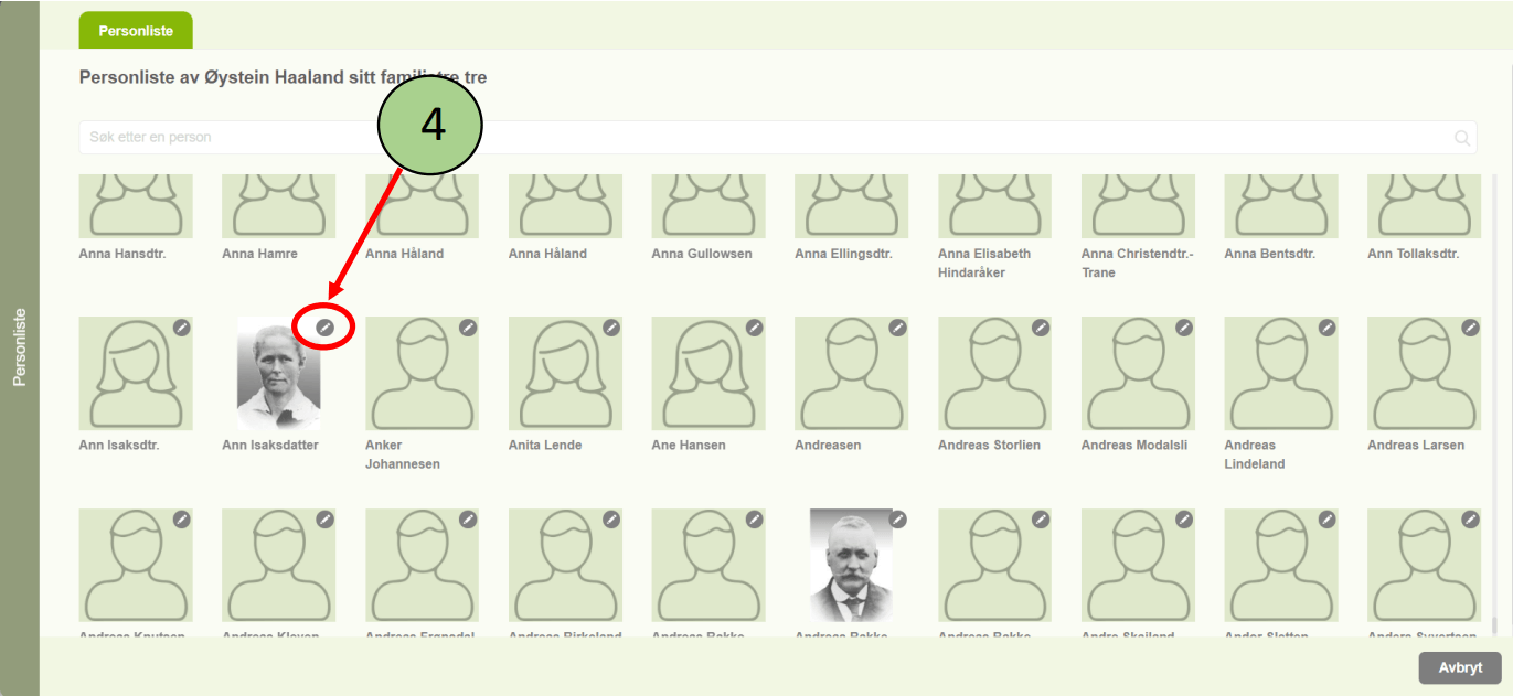 2. Denne listen inneholder alle personer i hele familietreet med navn og bilde.