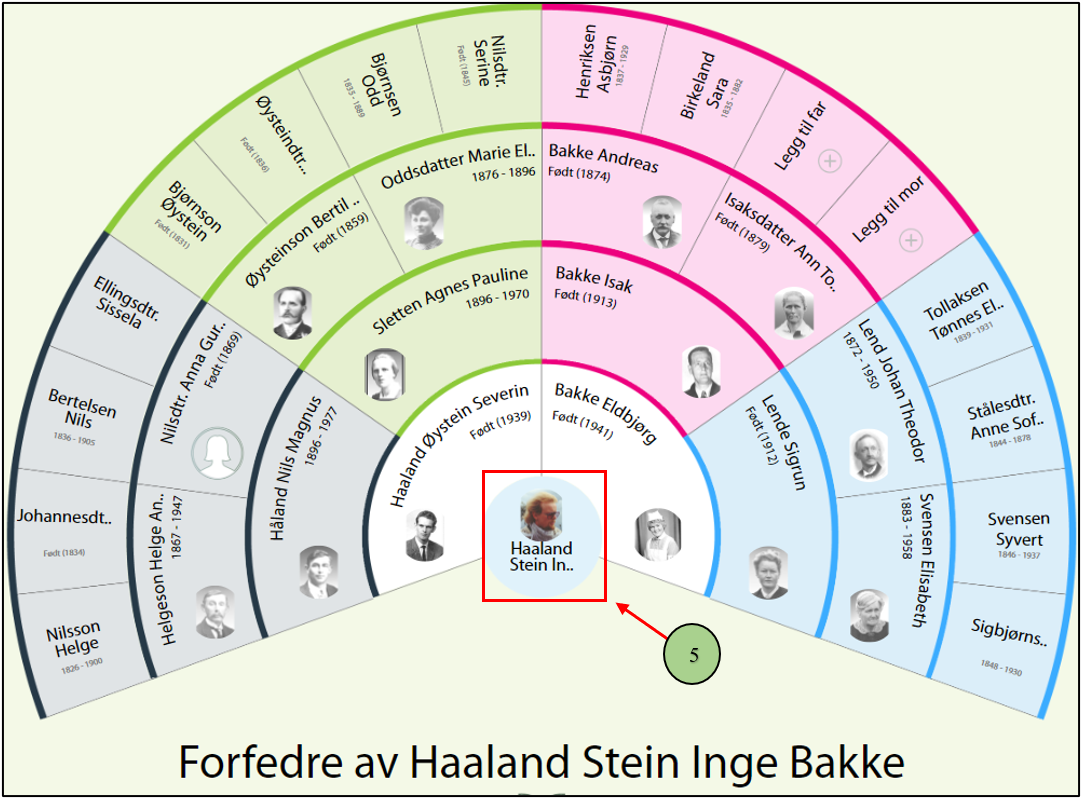 Det er mulig å velge en overskrift for rapporten og hvor mange generasjoner som skal vises. Det er mulig å vise opp til 9 generajoner med forfedre.