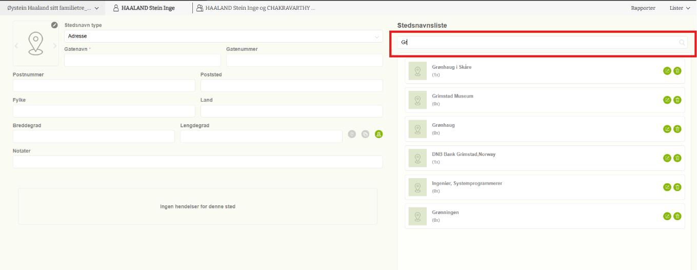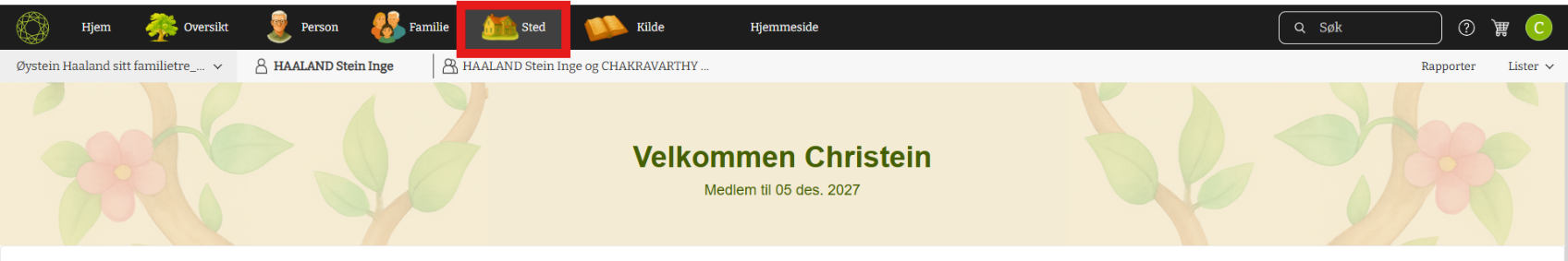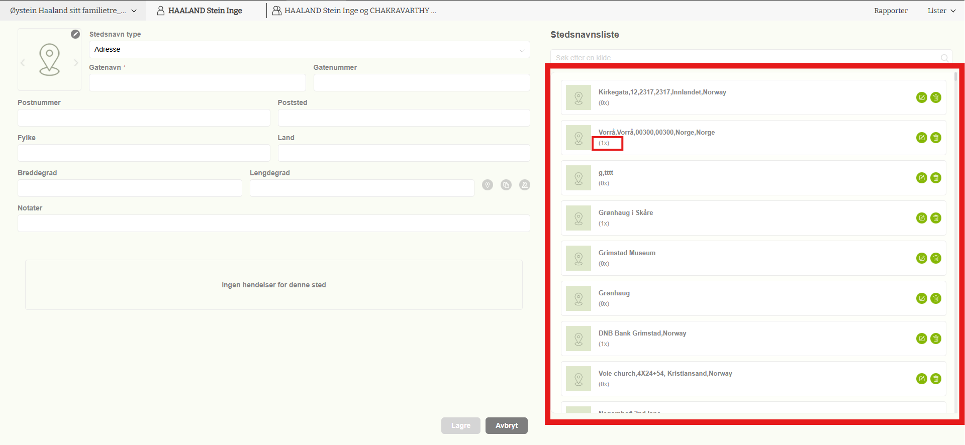 Dette åpner listen over alle steder som er knyttet til ditt slektsprosjekt.