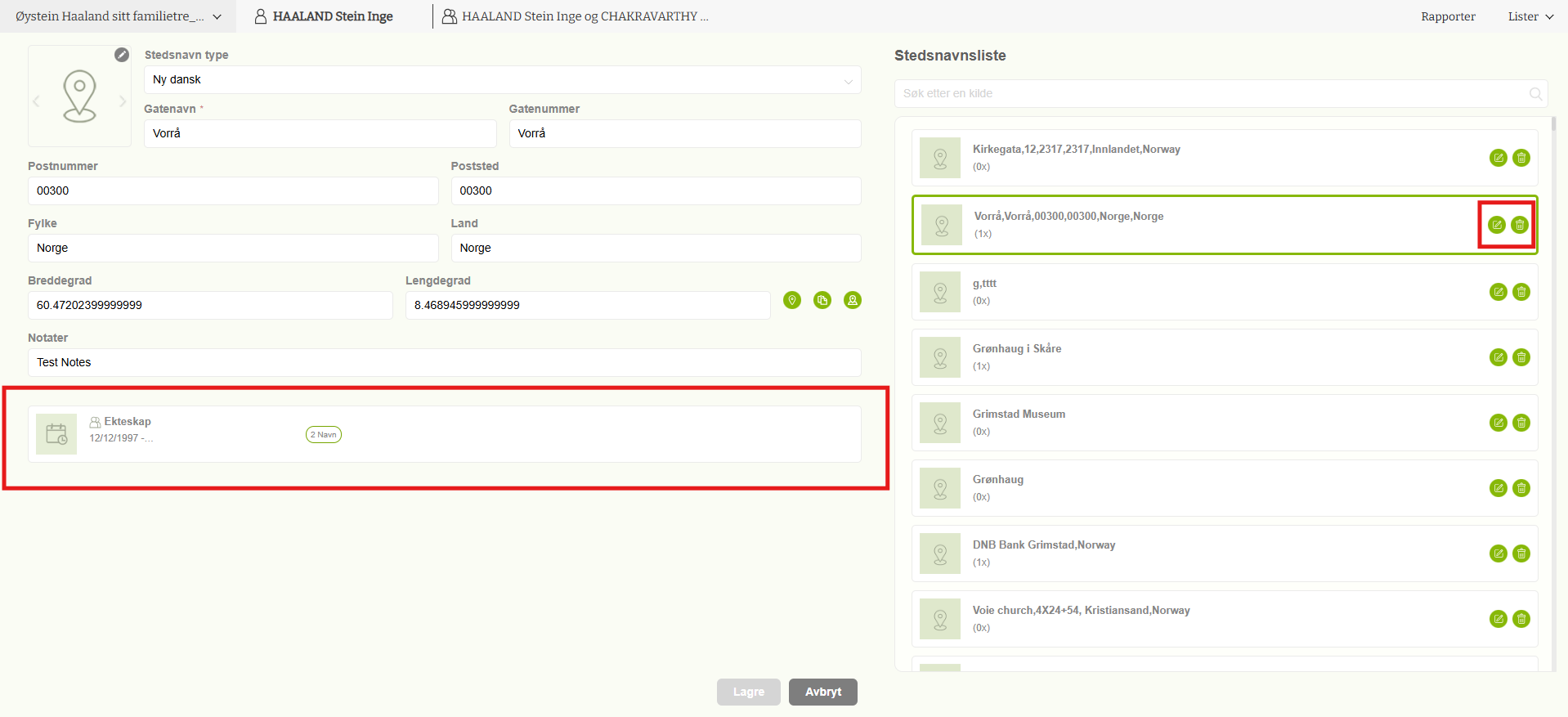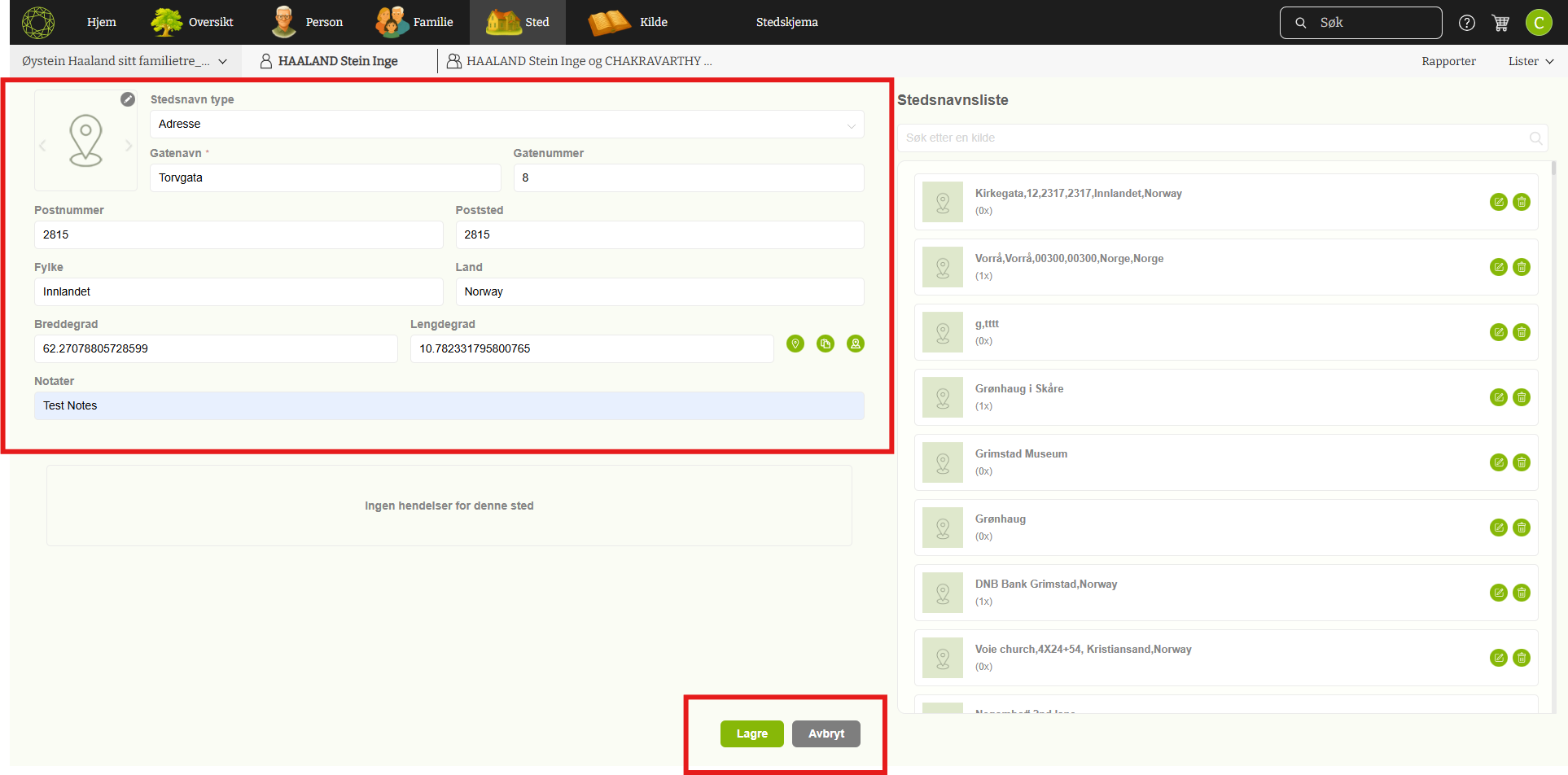 Under skjemafeltene ser du en oversikt over alle hendelser der stedet er brukt (for eksempel Født, Døpt, Gift, Død).
