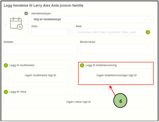 6. En kildehenvisning er alltid bra for å bevise at hendelsen har skjedd og slik at andre familiemedlemmer senere kan gå tilbake til samme kilden på et senere tidspunkt. Kilder er alltid godt å registrere.