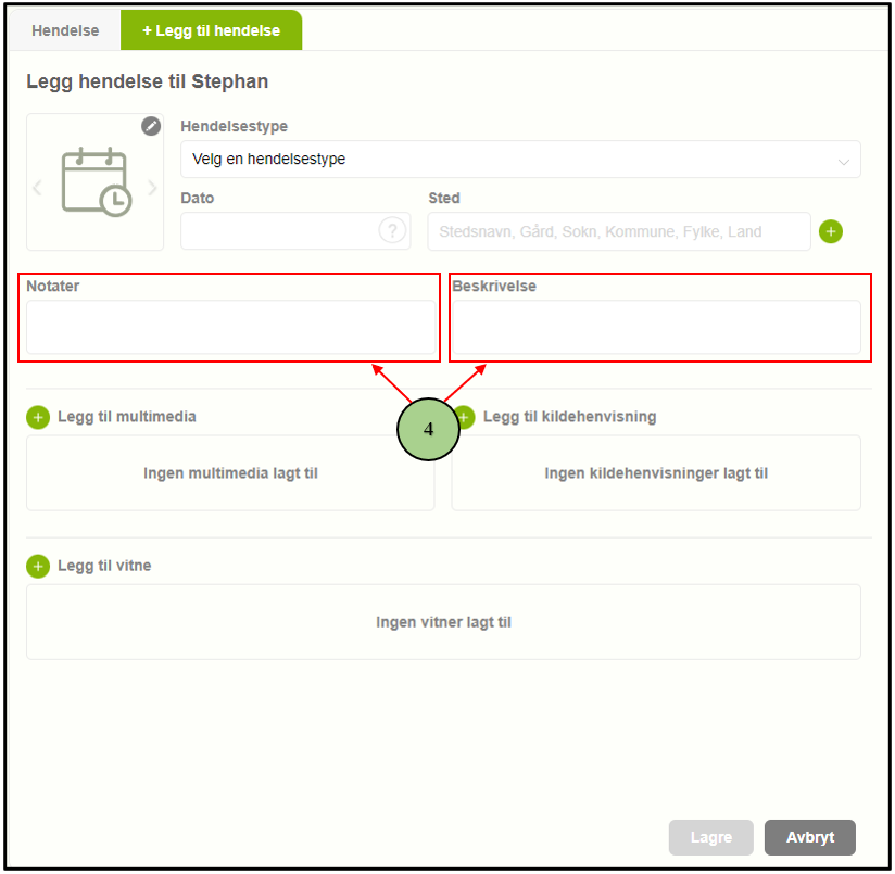 4. Register et notat og en beskrivelse av hendelsen. Dette er to fritekstfelt hvor det er mulig å skrive hva man måtte ønske.