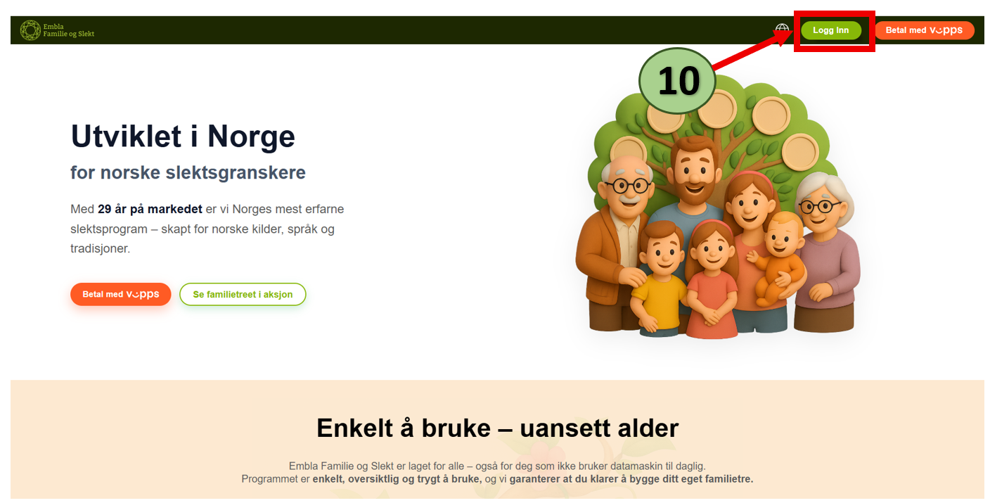 9. Gå til www.embla.no for å få tilgang til versjon 10 (V10) av Embla Norsk Familiehistorie.