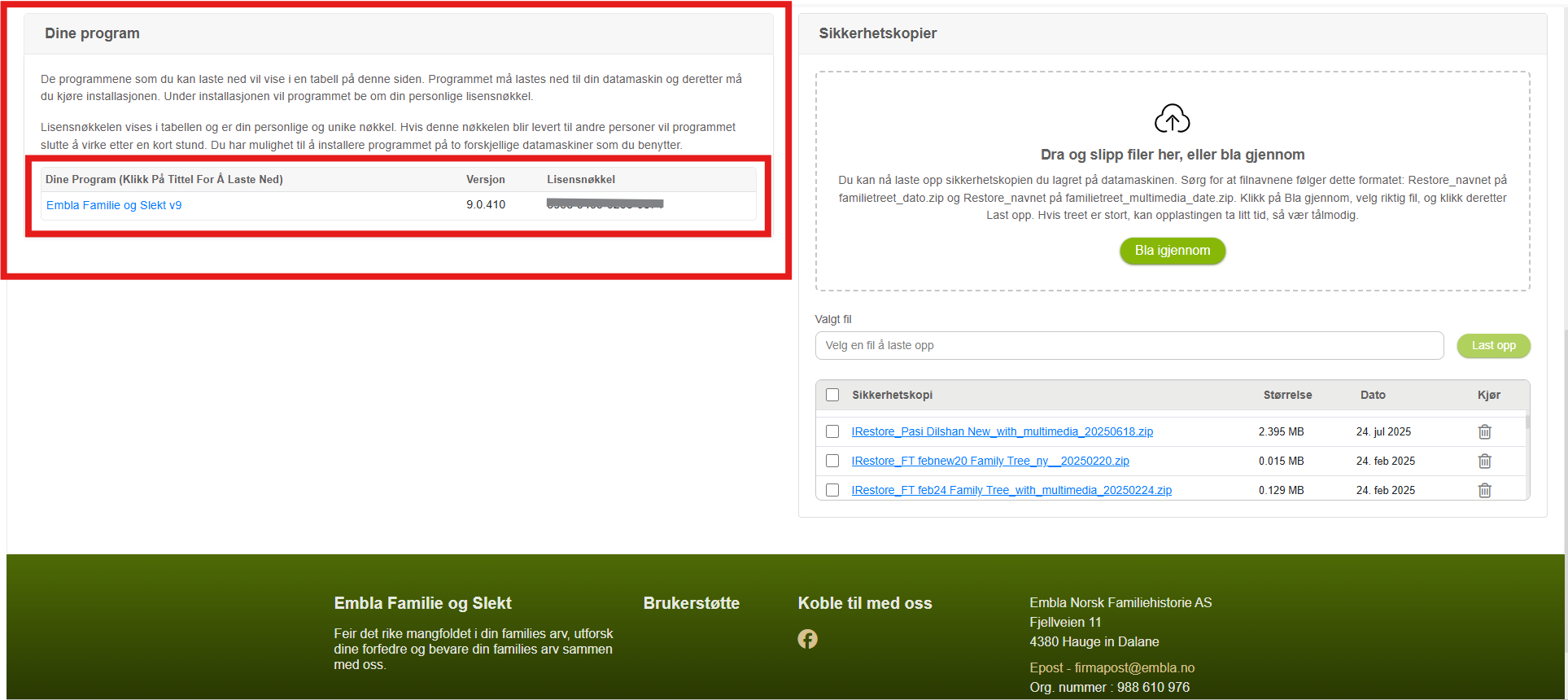 Lisensnøkler og informasjon om eldre sikkerhetskopier vises kun dersom det er relevant for kontoen din, det vil si for brukere som tidligere har kjøpt V8 eller V9.