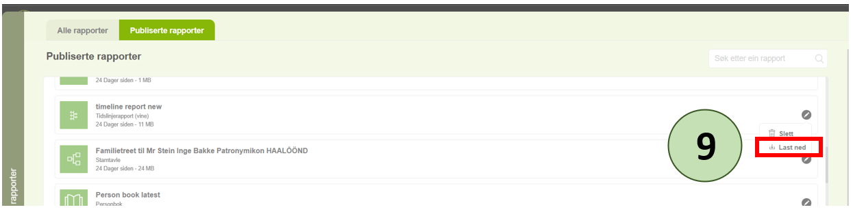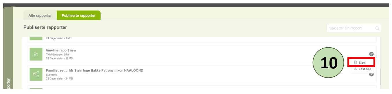 10. Hvis du vil slette en generert rapport, klikker du på Rediger-ikonet ved siden av rapporten og velger «Slett»-ikonet.