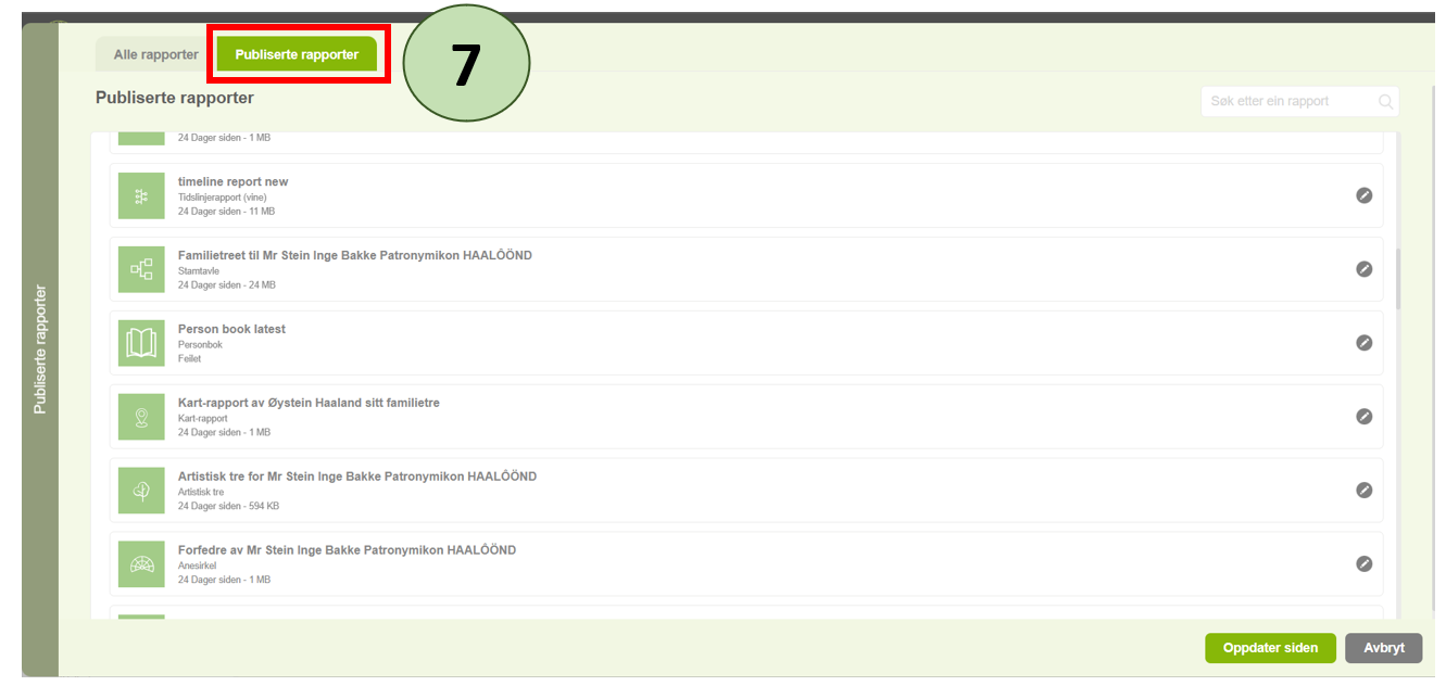 8. I dette panelet kan du se alle dine publiserte rapporter.