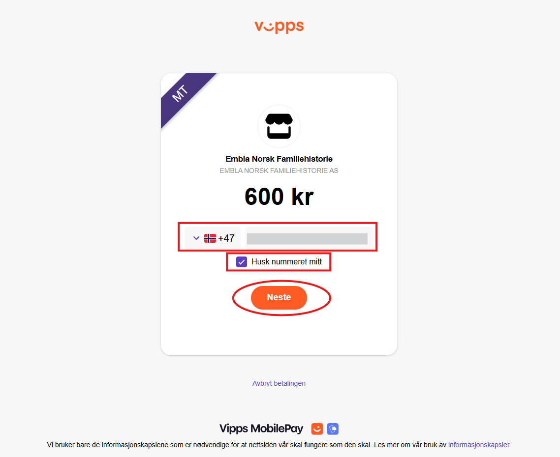 - Skriv inn mobilnummeret som er registrert i Vipps og nødvendige detaljer.