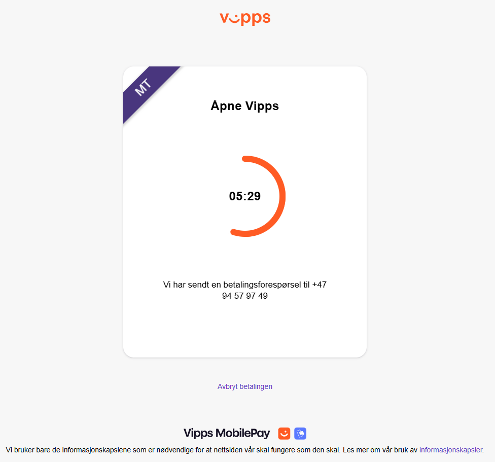 - Du vil se en nedtelling som viser hvor lang tid du har til å fullføre betalingen.